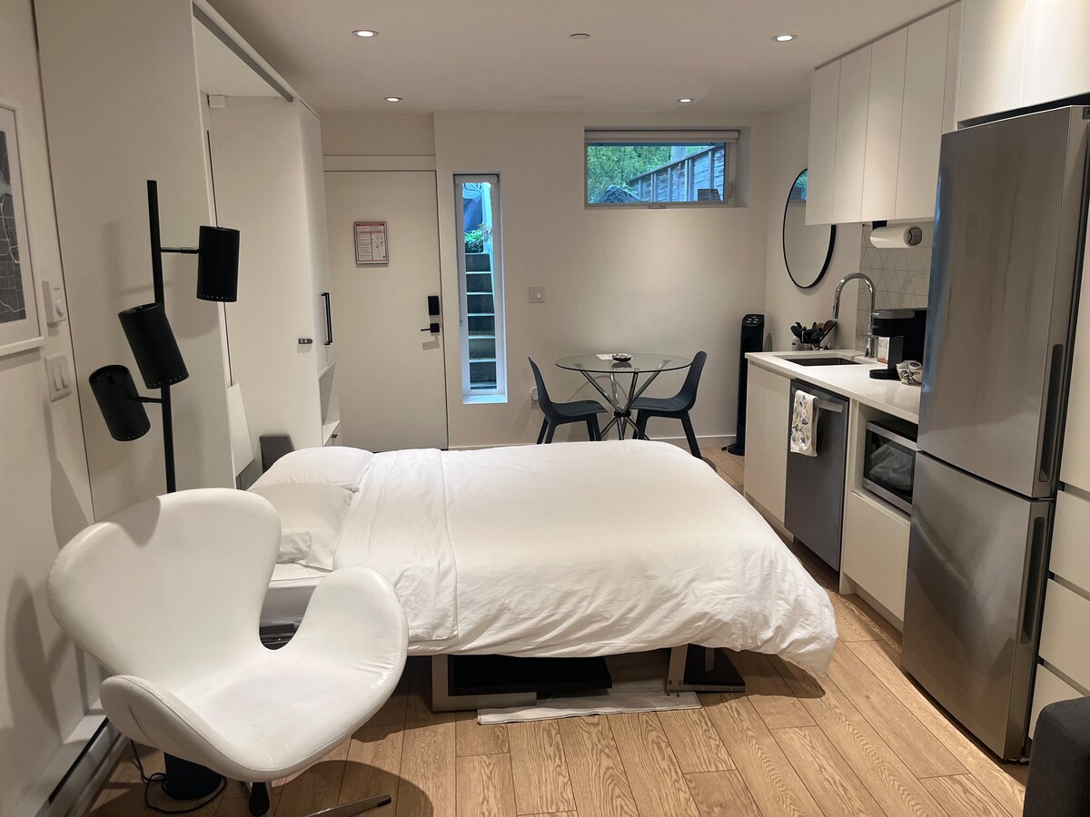 A bright basement bachelor suite in our duplex located in Mount Pleasant, walking distance to trendy Main St & Commercial Dr. The space is a private self-contained unit accessed via its own front door w/ keyless entry, equipped with a full kitchen, bathroom, full-sized washer & dryer, TV/wifi/keurig. The bed is accessed via a brand-new queen-sized Murphy bed system from California Closets, which folds up to become a dedicated work space. Also included is a sofa bed. Free street parking available
