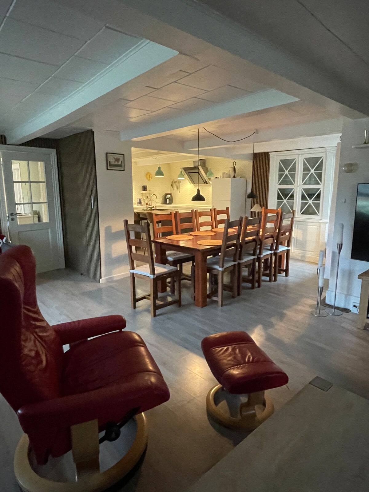 Large house with room for one or more families. Living room in connection with kitchen with room for many around the table. 4 rooms and extra sleeping places on the landing and 3 bathrooms. Garden with large tiled area and orangery with dining area. Located in a small village, with a good beach, ice house and forest only a few hundred meters away Trampoline, table tennis, table football, Gas Grill and charging station 1/2 hour drive from Odense, Vejle, Kolding and 2 hours from Copenhagen.