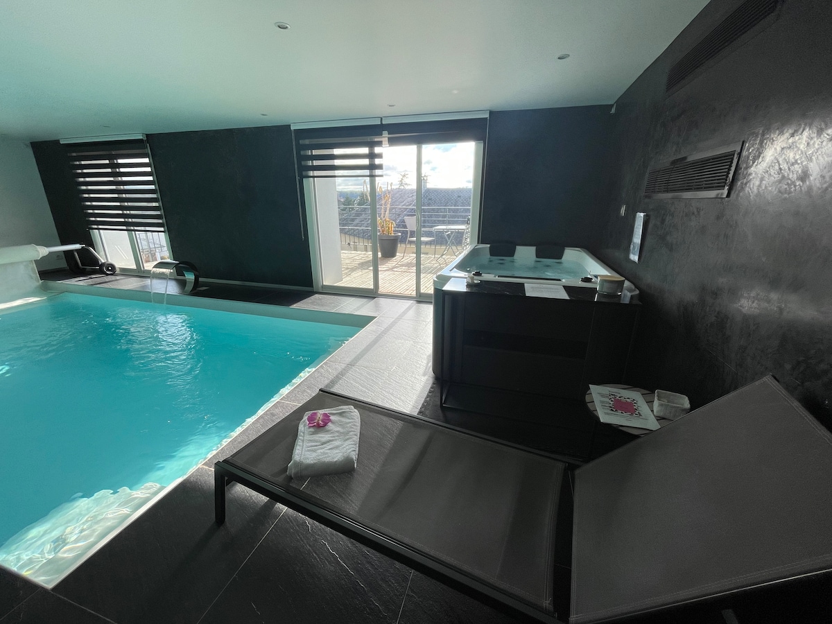 Beautiful suite with heated indoor pool (30/31) next to your king size bed Private indoor pool & jacuzzi directly in your room and to be used whenever you want. Plus in your suite. - Stretching area with mirror. - Bluetooth speaker - South-facing terrace with cathedral view. - first breakfast basket offered. Exceptional option: - Poolside massage. - Breakfast box/local board delivered to the room
