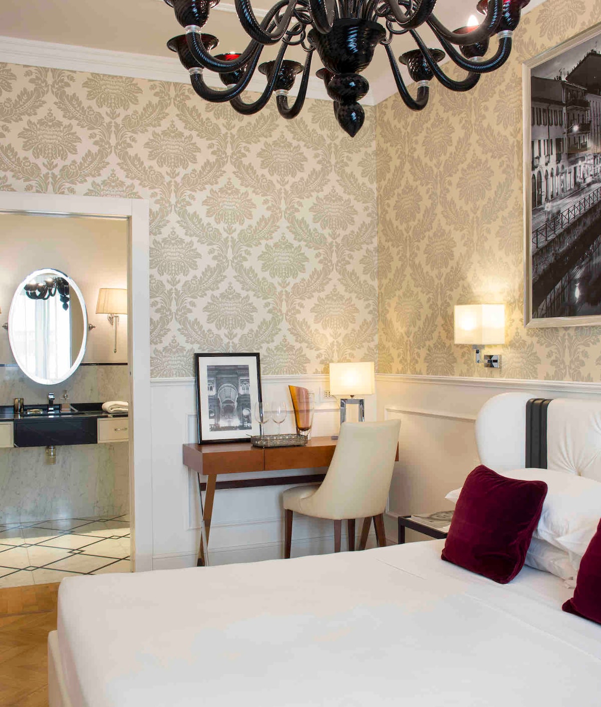 The top of refinement. Be seduced by the leather bed with capitonné, with orthopedic mattress and soft pillows. Walk barefoot on hot and fine oak flooring, admire the precious twelve arms Venetian chandelier that lights up the room