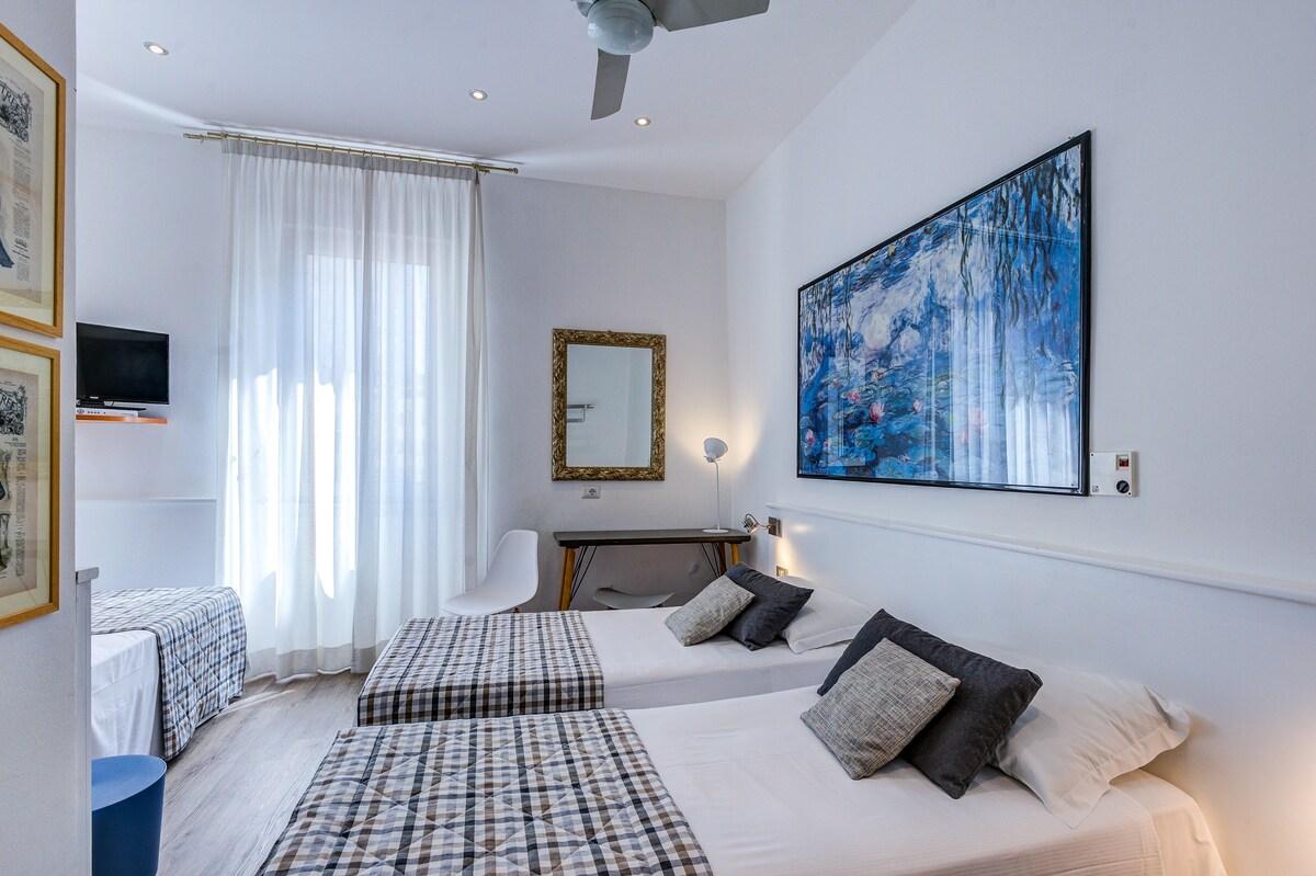 Triple room with 3 single beds, about 19 square meters, private bathroom with shower and hairdryer, safe, minibar, direct dial telephone, central air conditioning and heating, desk, parquet, flat screen TV, satellite channels, alarm clock. We will also be happy to provide you with information to visit Milan.
