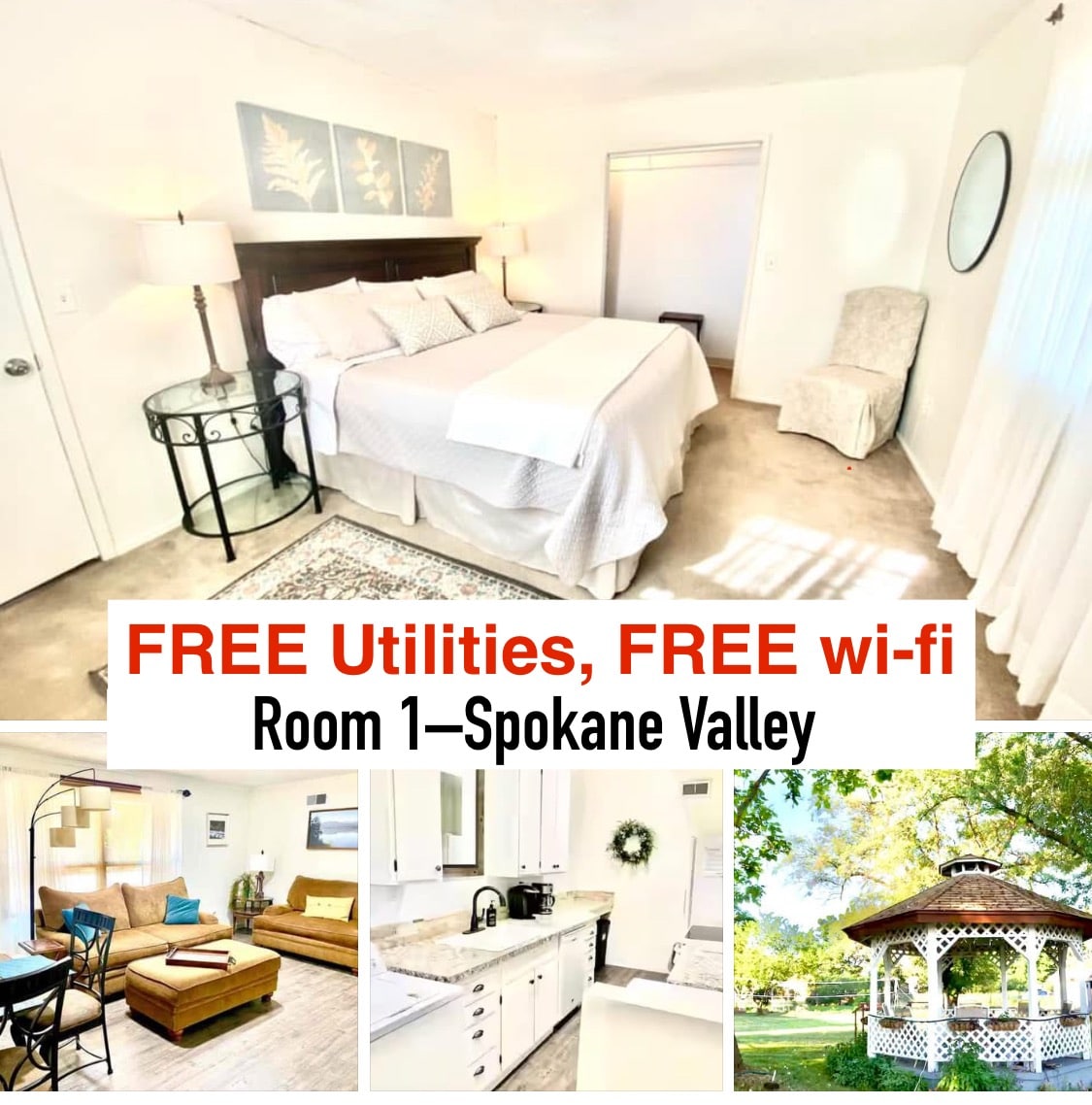 1 bedroom in-law apartment. Bedroom features a newly updated bathroom, king size bed and small futon. The front room has a desk and small kitchenette. The apartment has it's own entrance and is closed off from the rest of the house. There are no common areas besides the front yard. The house is located 10 to 15 minutes east of downtown Spokane.