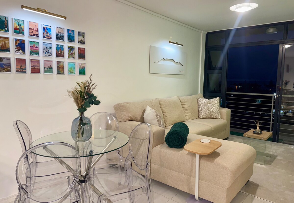Enjoy stunning sunsets and amazing ocean views from every room. Views of the ocean, Table Mountain, Robben Island, the beach and a golf course. Our 2 bedroom self-catering apartment is within walking distance to the beach and close to the city centre (8 km away). 124m² Modern apartment, with a private laundry area. Enjoy spectacular views of Table Mountain, Signal Hill, Lion's Head, Robben Island & the lagoon. Fast Fibre Internet, Netflix & Apple TV! Back-up power inside apartment & for lift!