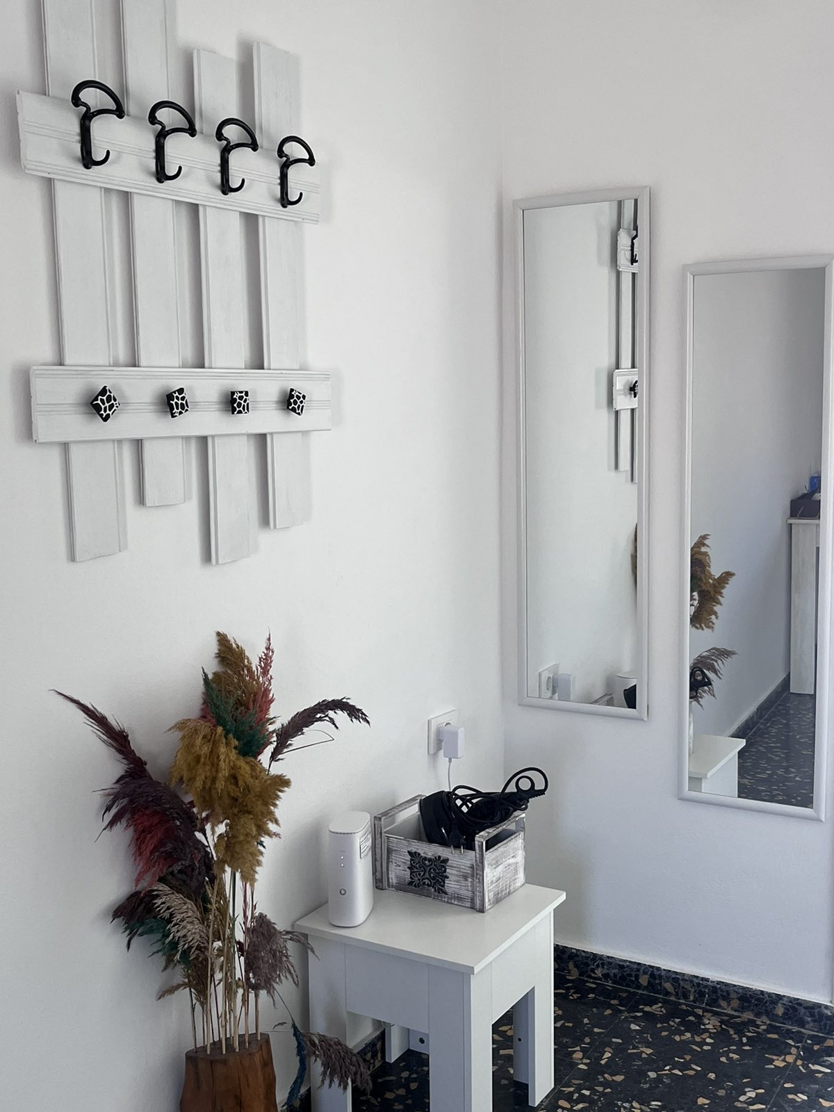 An open space beach house, of 60 s.m. for 6 pax with 1 double bed, 2 sofa beds and 2nd room with 2 single beds very stylish and comfortable. It is decorated with boho and cozy design styling combined with Cycladic culture. The house has direct access to a sea view veranda, with a big dining table. It is situated on a small bay, with similar moon white rocks as Sarakiniko that form a secluded cove in front of the house, together with Aqua house 1 & 3. Welcome basket with local products offered.