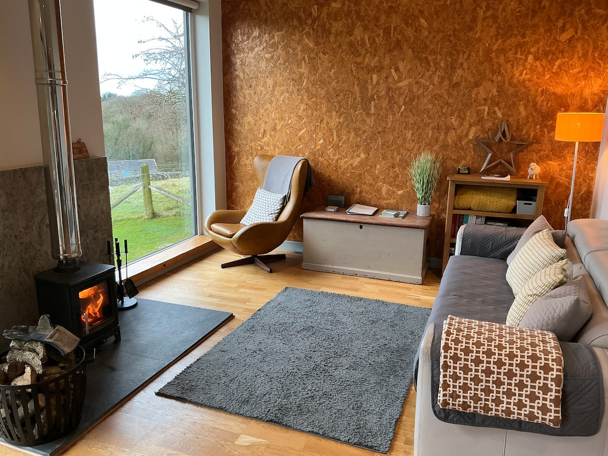 Wrens nest is a cozy one-room cottage with an open plan design that combines charm with functionality. The main room features a simple layout where the bed, sofa and kitchen area share the same space. The comfortable oak framed bed has neutral linens and bedside tables with reading lamps. The two seater sofa has small foldable tables for dining. The kitchen occupies one wall with simple cabinets, two burner hob, fridge, microwave and small air fryer. The shower room has wc & sink with storage.