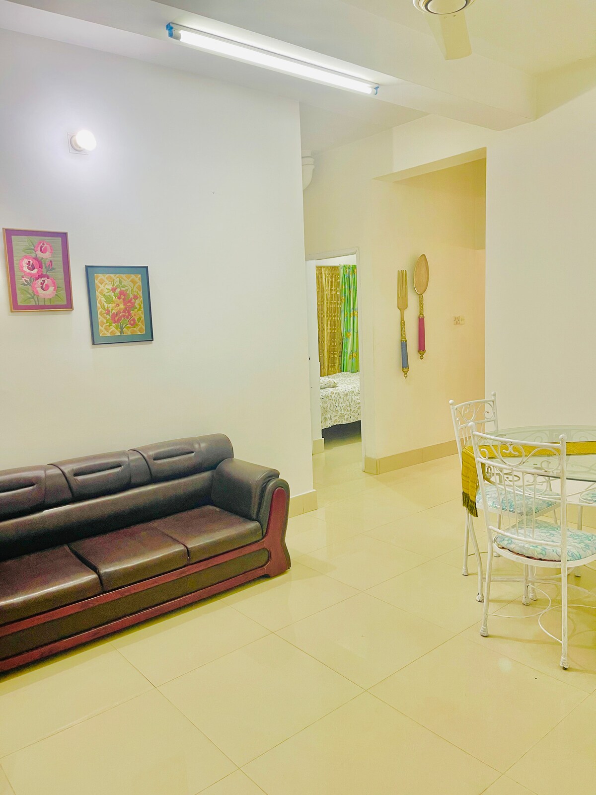 This cozy 4th-floor home combines comfort and convenience with a bright bedroom, wall cabinet, seating area with TV, prayer room, workstation, and dining space. The kitchen includes a fridge, oven, and HI-TECH water filter for easy living. Essentials like geyser, Wi-Fi, and AC in both bedroom & living area ensure comfort. Located next to Gulshan Aarong outlet and walking distance to food shops, it’s perfect for quiet reading, working from home, or simply relaxing for maximum 2 people.