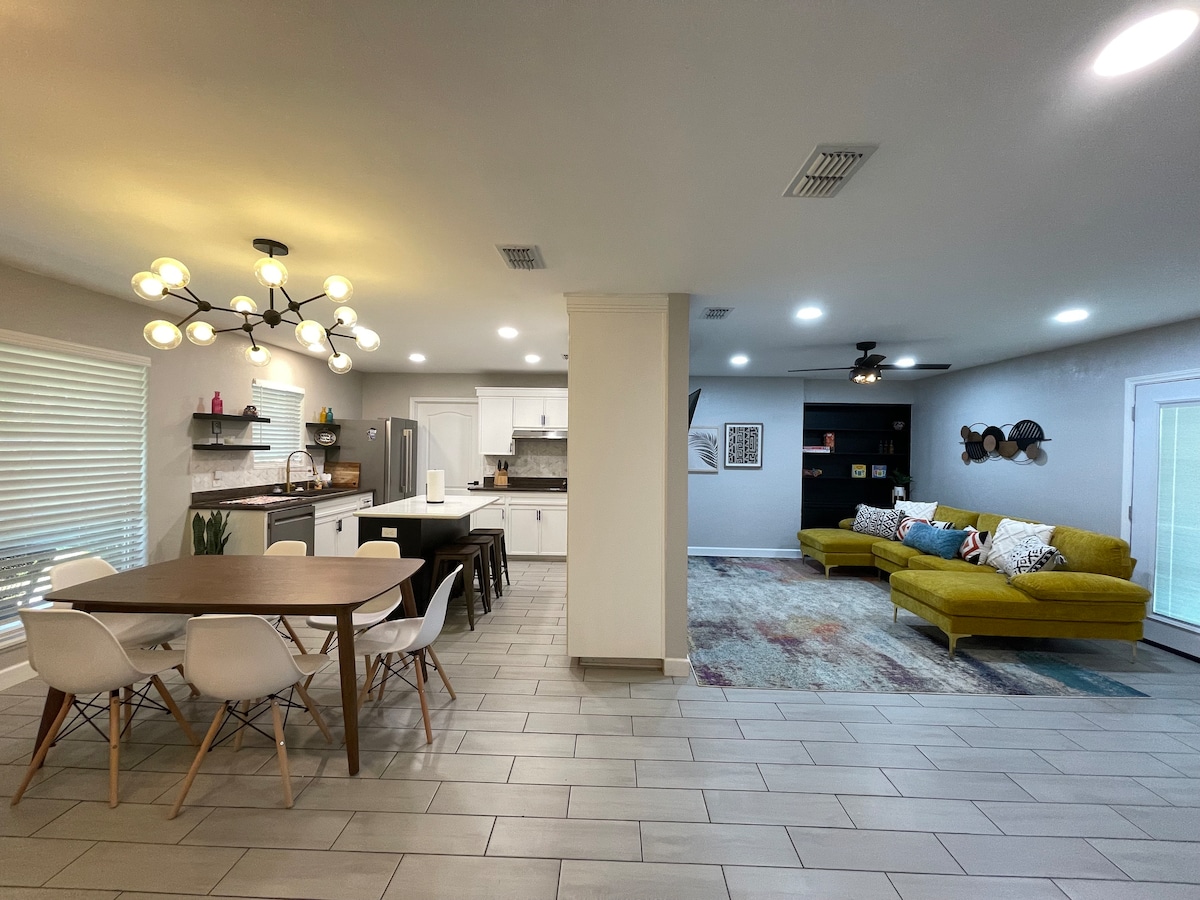 Stylish Stay for Groups, Business Trips, Families & Medical Visits Enjoy a one-of-a-kind property in a prime location — just minutes from the airport, medical district, shopping mall, Target, and the convention center. This modern home features a spacious open-concept living and kitchen area, a massive 100-inch screen for movie nights, and a covered patio perfect for outdoor dining.