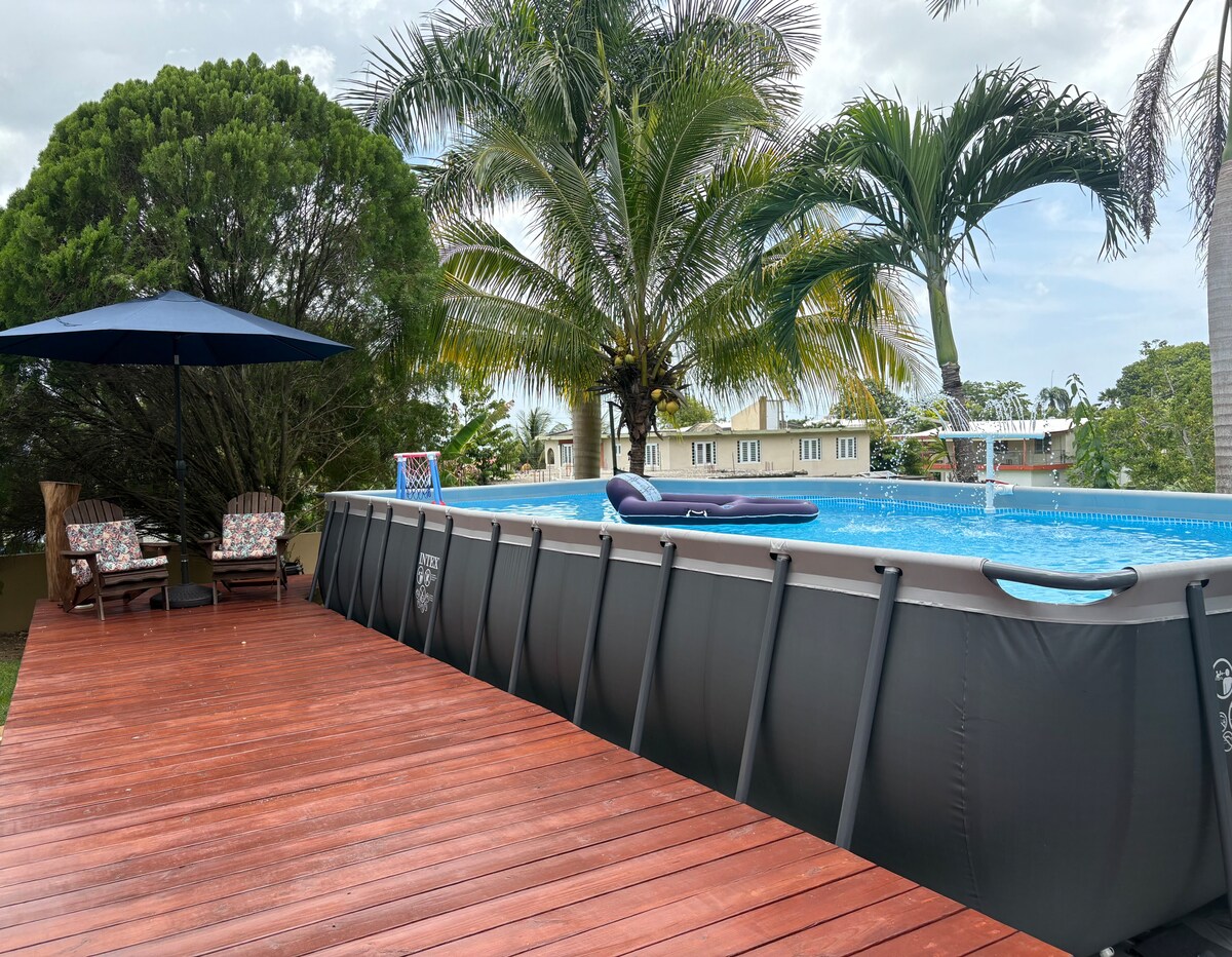 This is a private apartment on the first floor of a family house with its own kitchen and bathroom. The bedroom has a queen size bed, a twin bed, and AC. There is a queen size sofa bed in the living room, AC and a Smart TV. You can relax on the deck or above ground pool. We also have solar panels. The apartment is ideal for up to 5 guests. Although it is located in a residential area, it is close to everything you can need. Close to the Aguadilla Airport and 7 miles from Crashboat Beach.