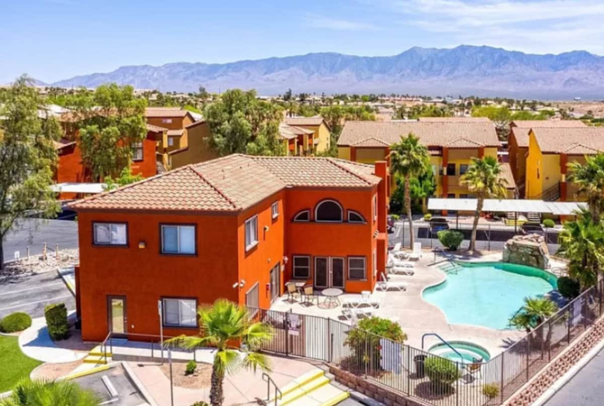Beautiful 3 bedroom, 2 bathroom condo located next to Wolf Creek Golf Club, Oasis Golf Club (36 holes) and walking distance to the casinos. The space features two master suites with king size beds, and a third spacious bedroom with a queen size bed and twin bed, as well as a queen air-mattress. There is a working space for two in the upstairs master suite that is perfect for working from home. The condo complex offers a swimming pool, hot tub and gym. City of Mesquite License #99113