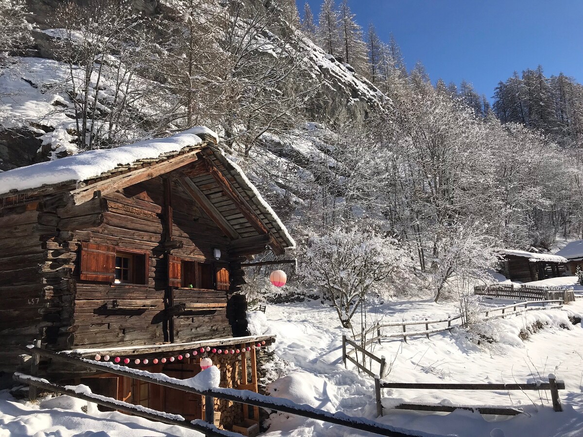 Authentic period plank log cabin set on "mouse" stones with stunning views of the Dent Blanche, the Dents de Veisivi and the Ferpècle Glacier. Bathed in sunshine, this exceptional place has been lovingly renovated by combining tradition and modernity. It is located at a place called Anniviers (Saint-Martin) in the Val d'Hérens at 1333 meters above sea level. Relax in this place full of history in the middle of untouched nature.