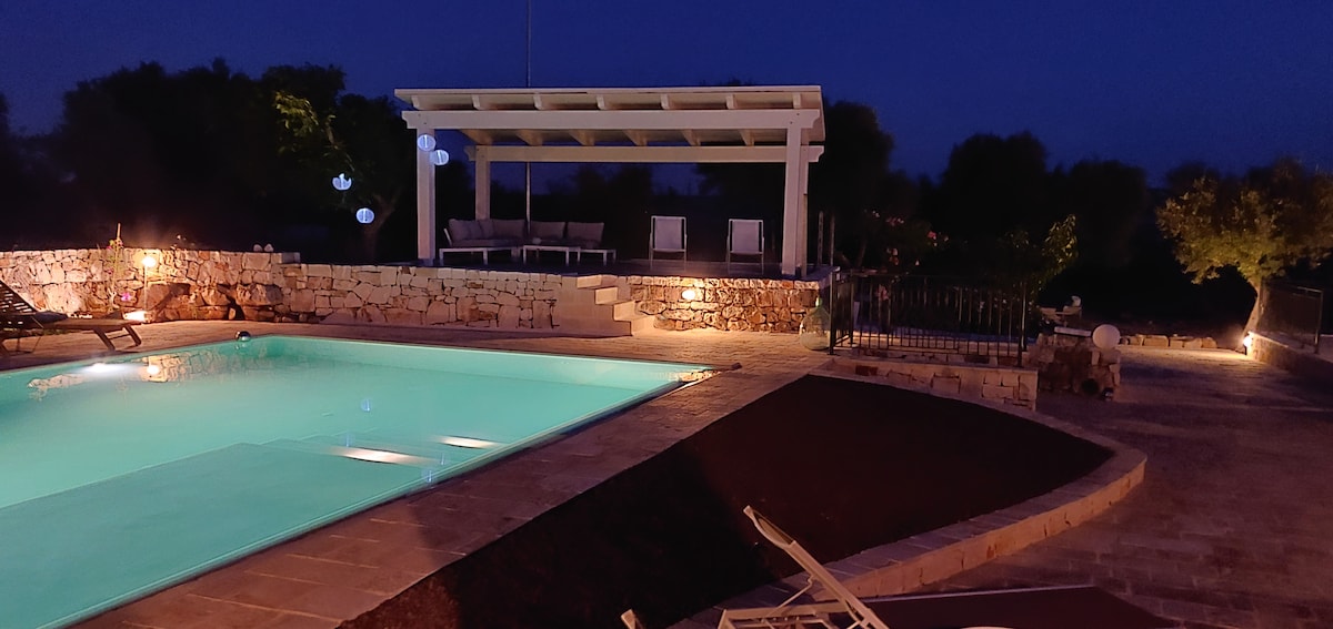 Trullo Roverella enjoys a privileged position, immersed in the quiet of carob trees and centuries-old olive trees, where time seems to slow down. It is part of an elegant complex of two properties, each designed to guarantee total privacy, with independent outdoor spaces and a private pool . The pool, facing the front of the house, is equipped with umbrellas and sun loungers, ideal for relaxing under the Apulian sun.