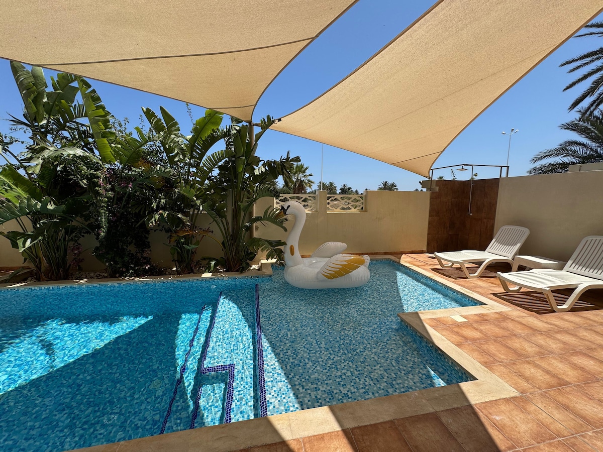 Dar FYOM is a large family holiday home with a private swimming pool, set in the heart of a lush green garden, ideal for families and groups of up to 12 guests. It features 5 bedrooms, 3 bathrooms, a spacious and welcoming living room, and a fully equipped kitchen. Just a 10-minute walk from the sea, a sandy path leads directly to the beautiful El Baghdadi – Beach. Close to Mahdia’s tourist area and the city center, it offers the perfect combination of comfort and location for a memorable stay.
