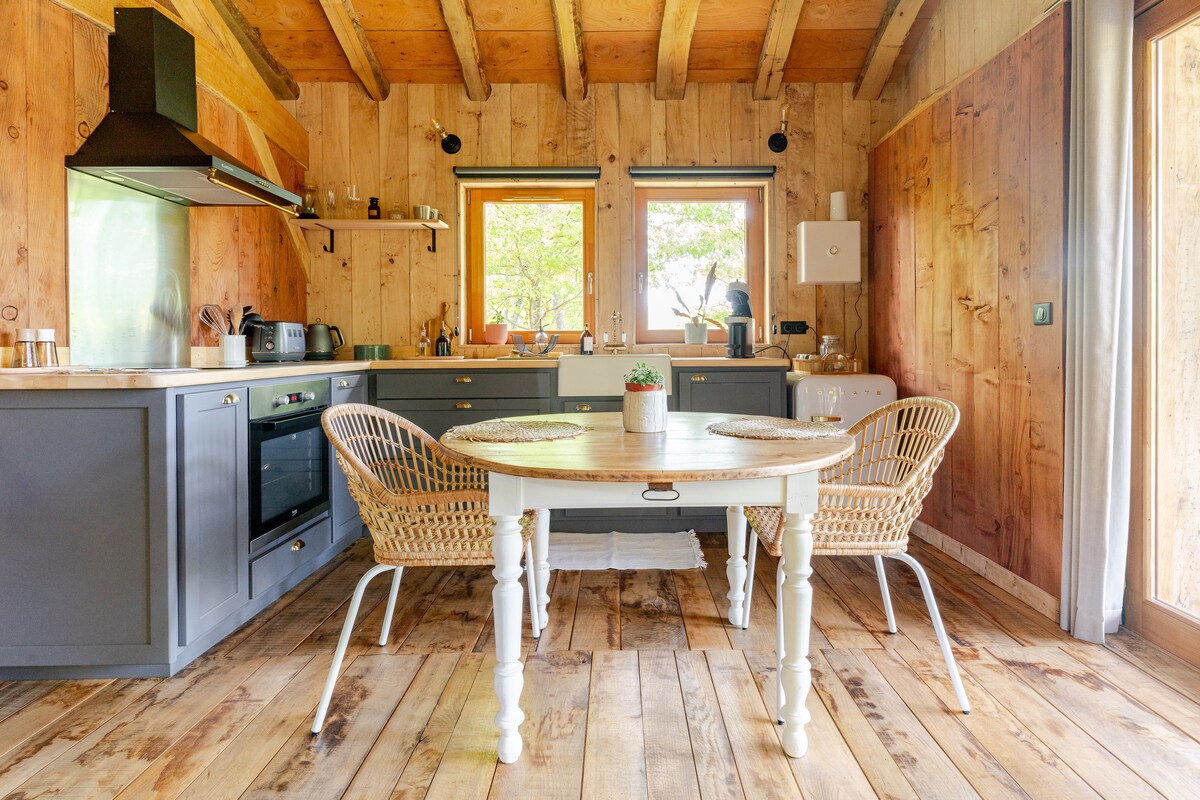 The Cabanoun welcomes you in its green setting perched 7m high. Nestled in a natural forest, come and discover this secret place that offers the best view to watch the sunset over a beautiful lake. You will also observe birds and animals, from one of the two terraces, or from the Nordic bath. Enjoy this place as a couple or family thanks to its ideal configuration: a double bedroom upstairs and a bunk bed on the ground floor.