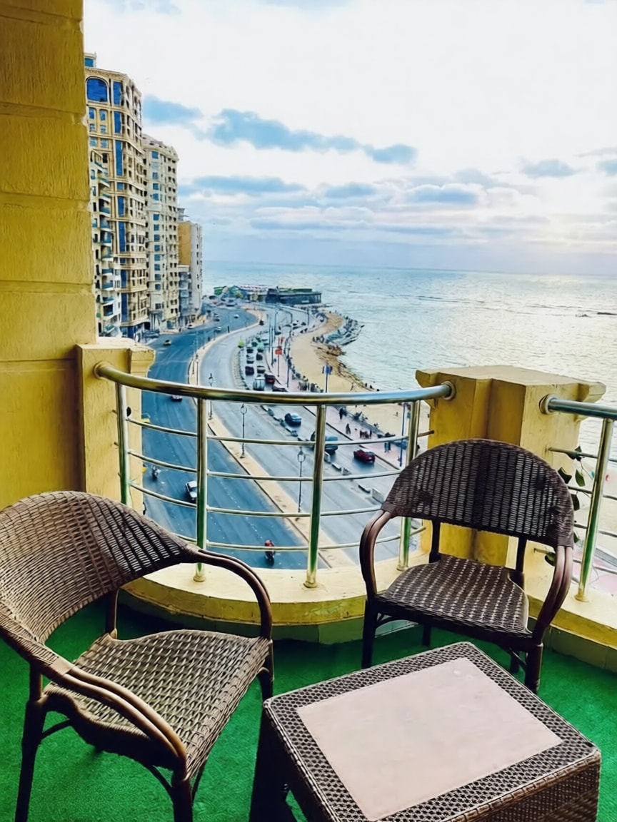 🏖️ About this space Wake up to endless Mediterranean blue in this elegant 2-bedroom coastal apartment in the heart of Alexandria. Although set on the second row, it enjoys a completely unobstructed panoramic sea view — no buildings block the stunning horizon. With a sun-soaked terrace, bright interiors, and a spacious open-plan living area, it’s your private seaside retreat, perfect for families, friends, or small groups seeking comfort, style, and unbeatable value.