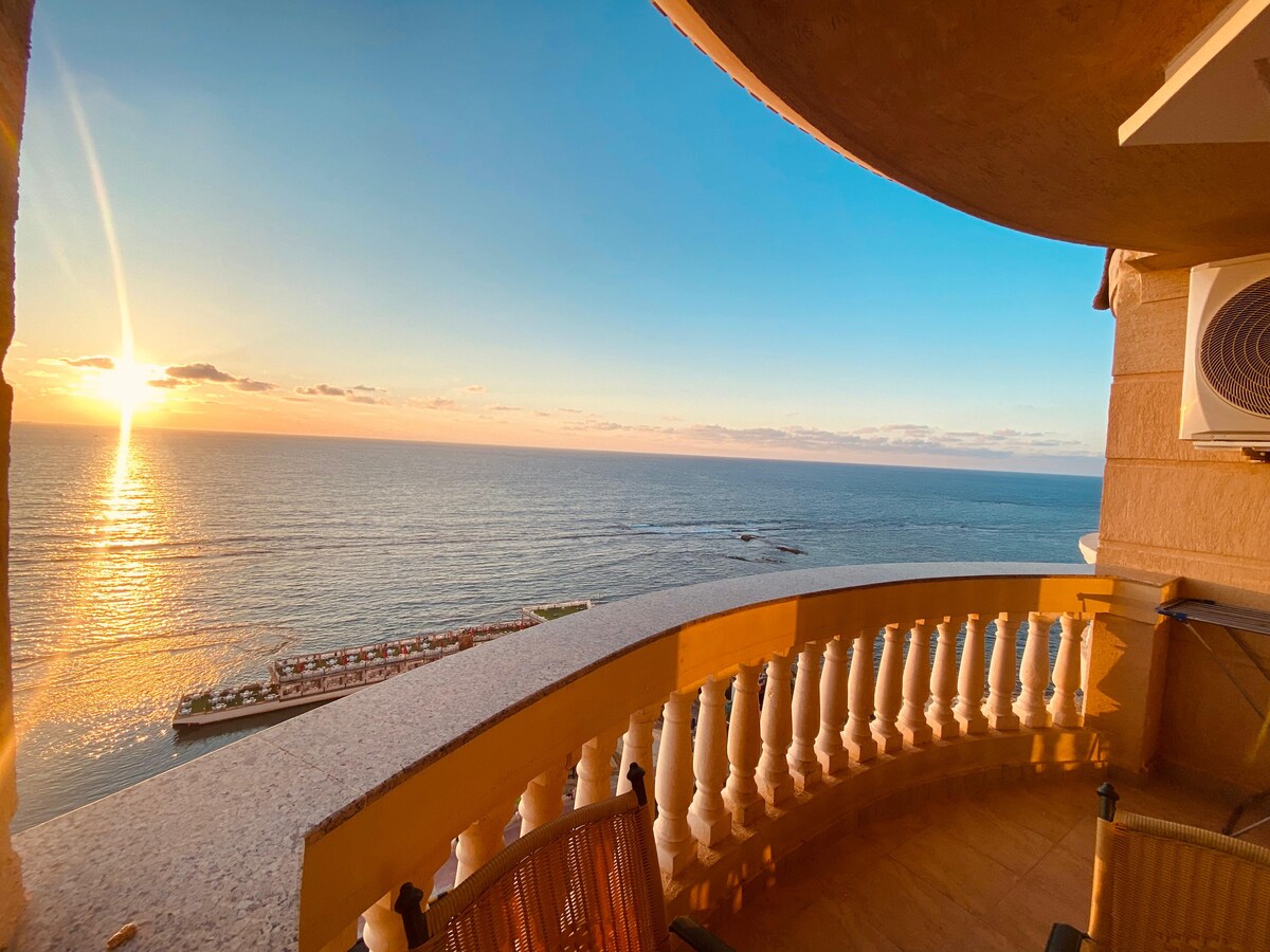 Stunning beachfront apartment with panoramic sea views in the heart of Alexandria, on the 15th floor. Bright, spacious setting with modern amenities and a private balcony and beach access. The building offers 24/7 security and assigned parking. Steps from the beach and close to restaurants, cafés, and shops. Sleeps 6: • 3 bedrooms (2 king, 2 singles) • 2 bathrooms with showers • Large lounge, fully equipped kitchen • Fast WiFi, satellite TV, fresh linens •Fully air-conditioned •Elevator access