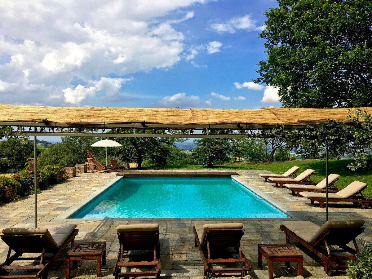 A small comfortable, romantic stone house in a tiny private country village dating back to the 13th Century, surrounded by 124 acres of fields and woods. Wonderful views: panoramic terrace with a view of the valley and, on clear days, up to the Alps. Swimming pool. Huge garden. To get to the property you need to drive through about 600 meters dirt road (unpaved). For safety reasons, children less than 12 years old are not admitted.