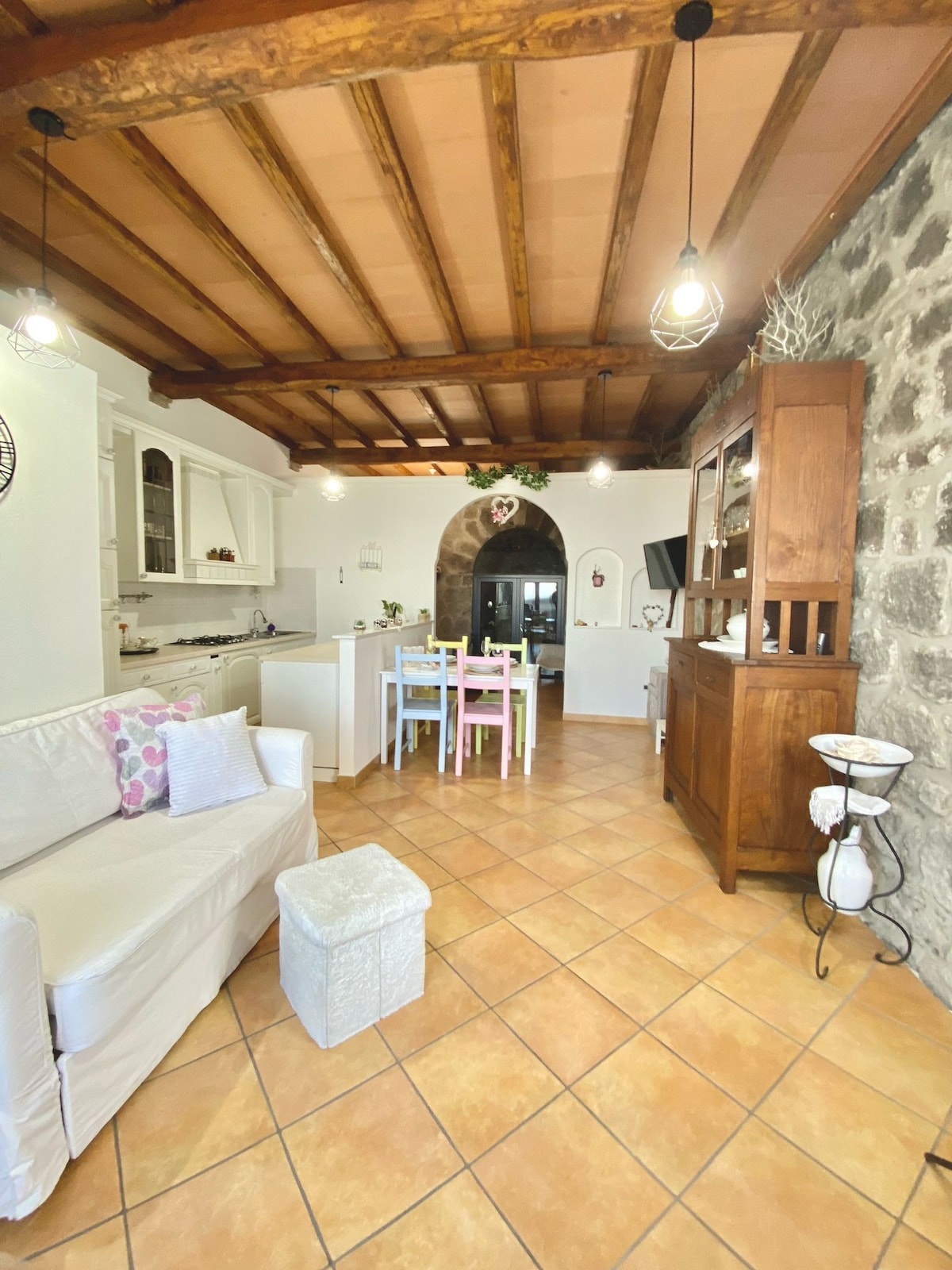 Located under the walls that line the Rocca dei Papi, it overlooks the beautiful Lake Bolsena, where you can admire breathtaking sunsets; a short walk from the historic center. All amenities are within walking distance. Located on the ground floor, with a frame of exposed beams and natural stone with a functional equipped kitchen, double bedroom, sofa bed, bathroom with shower, washing machine and dryer. The house is completed by a beautiful cellar that can only be admired from the outside. Pets are not allowed.