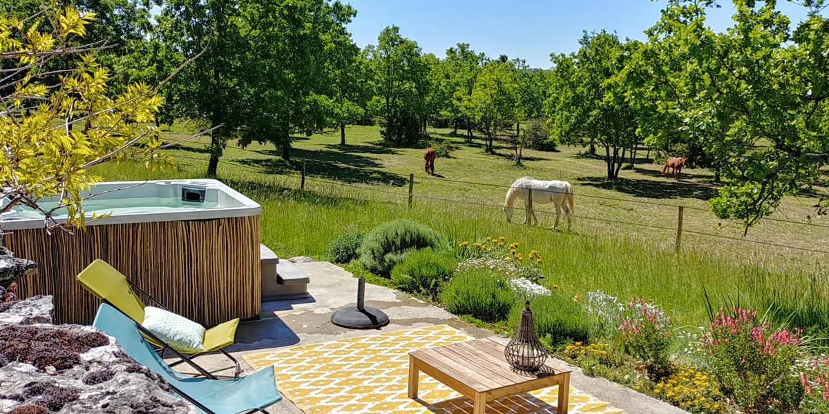 Nid surplombant une mer d'arbres. Ancien four à pain devenu une maison lumineuse à l'abri des regards, avec une petite cour japonisante à l'entrée, un jardin à l'arrière donnant sur une forêt, au cœur du Quercy. Rez de chaussée en pierre, étage en bois, poêle à bois (indispensable l'hiver !), chemins de randonnée immédiatement accessibles, nombreuses activités culturelles et sportives dans la région. Idéal pour amoureux de la nature, des promenades, du calme.