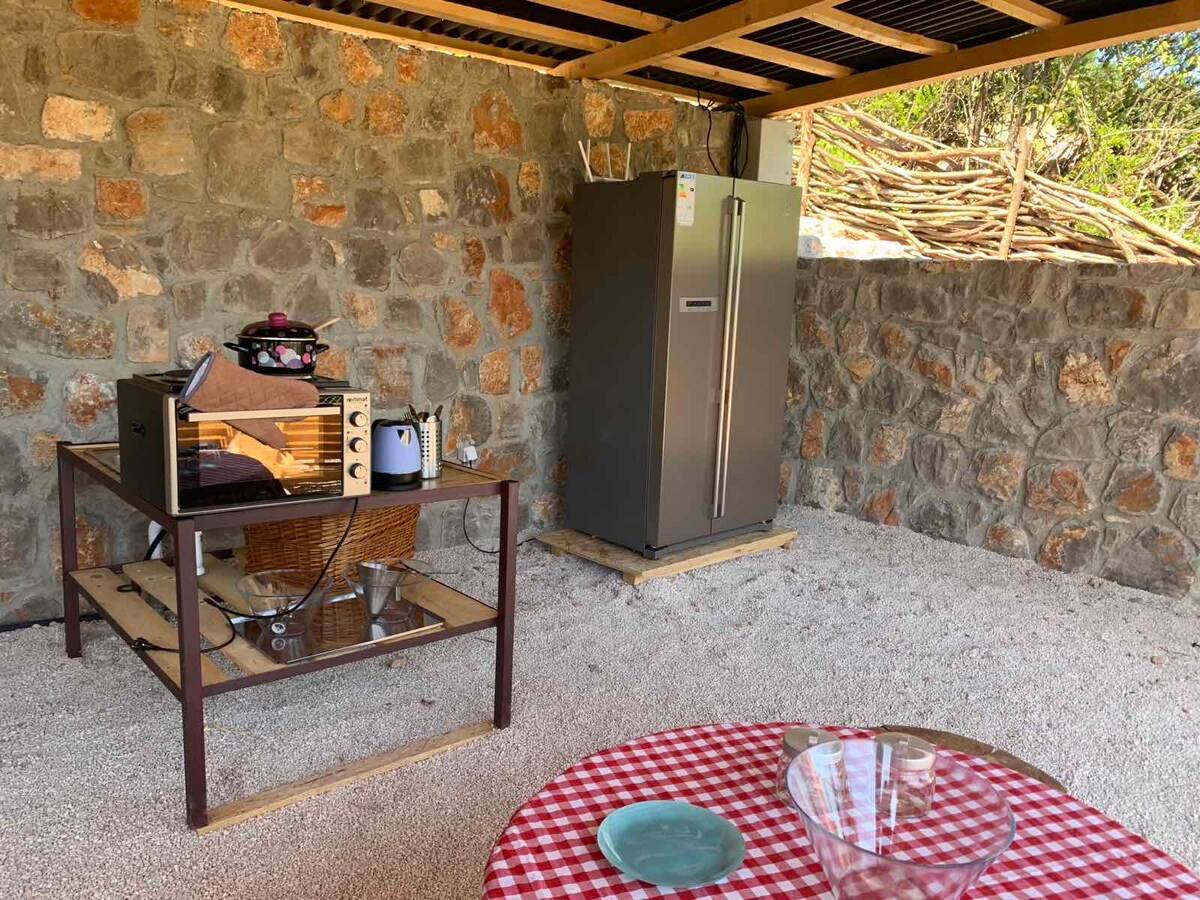 Enjoy the sounds of nature while staying at this unique place. In the middle of the oasis and a bit away (1600m) from Žanjic beach and at an altitude of 350m is the plot. Wake up with birdsong under the airy shade of olive groves. On a private cascade and terrace is this large and beautiful tent. On the same land that stretches over 1600 square meters, there is a wooden house and a slightly smaller tent. Welcome!