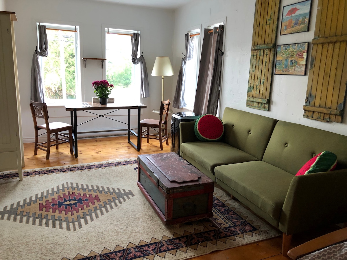 Centre of the quaint village of Knowlton. Beautiful studio, separate entrance. The front looks out onto an historic church. Back of the house looks out to a beautiful green space. Beautiful and peaceful winter setting. Great village for walking, close to hiking trails, ski hills. There is a pond that is full of life in the summer. You can see Canadian Geese, beaver, heron and many other wildlife. New Queen size bed in the space. I have a 2 night minimum, feel free to inquire for 1 night