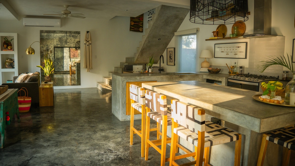 Awaken your spirit by the sea. Nestled in El Paredon, Guatemala. This private 2-bed, 2-bath haven intertwines modern comfort and rustic charm, a short stroll from the beach. Embrace practicality with a well-equipped kitchen, hot showers, a sleeper sofa, & agua vida on tap. Immerse yourself in serenity on the poolside or terrace, enjoying the afternoon breeze with air conditioning as an optional companion. Our unique dwelling offers a space for tranquility, find solace by the soothing waves.