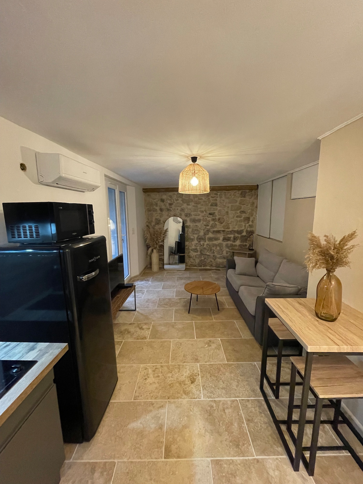 Superbly well located for discovering Pierrevert and our beautiful region, alone or as a a couple. Freshly renovated 25 m2 studio, in the heart of the village. Entrance, equipped kitchen (2 induction stove, fridge, mini-oven, coffee maker, kettle, washing machine), living room with sofa bed and a real double mattress. Bathroom with walk-in shower and toilet. You can also enjoy the outdoors with a large 25 m2 terrace and its furniture, BBQ.