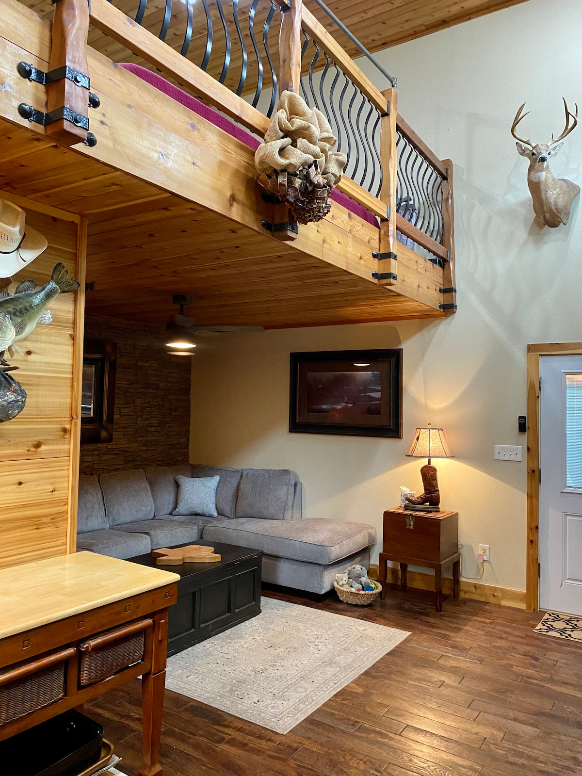 Unique Rustic Tiny Home Barndominium. ( longer stays are best here) 2 full beds in loft 1 queen fold out couch in downstairs living Fully stocked kitchen with dish Washer Wash and dryer Shop/ barn area is common space Note: access to loft area is in the barn- see stairs on outside of tiny home Hanging rack for clothes 60” smart TV Wi-Fi 2 zone mini split AC system Fire place Large pit and pellet smoker available upon request