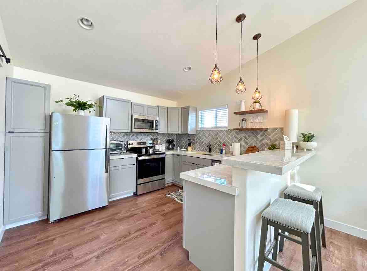 Charming! 2-bedroom home just 4 blocks from Main Street’s restaurants, bars, and shops. Features two queen beds and a queen sleeper sofa, a fully stocked kitchen with blender and Instant Pot, laundry, and two driveways for easy parking. Relax in the fenced backyard with a grill and dog door—pets are welcome! Enjoy a quiet neighborhood atmosphere close to the airport, making it the perfect spot for families, couples, or small groups to unwind and explore the area.