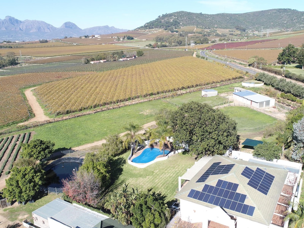 Kick back and relax in this calm, stylish cabin far away from everything. Situated on the edge of the farm, on the slopes of the Porceleinberg. It operates completely off the grid. On the porch/deck you'll have a 180* view of the valley towards the Elandsberge and the Winterhoekberge beyond. In spring the valley will be coloured in patches of green (wheat fields) and yellow (canola fields).There are more than 130+ species of birds on the farm, as well as small antelope.