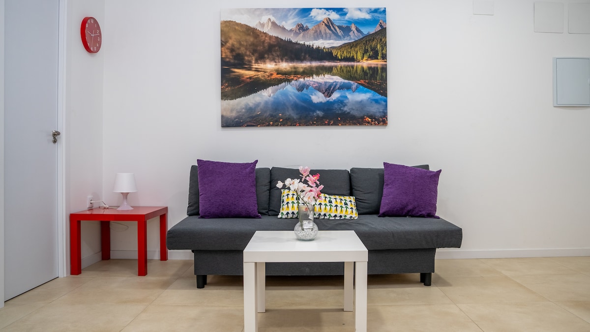 Disfruta de la sencillez de este alojamiento tranquilo y céntrico. Recién reformado con materiales acogedores. A dos minutos del ayuntamiento y de la catedral. A cinco minutos de la estación de tren y metro para viajar a cualquier sitio. Junto al apartamento hay varios supermercados, farmacia, modista, dentista, churrería y un bazar. Getafe cuenta con hospital.