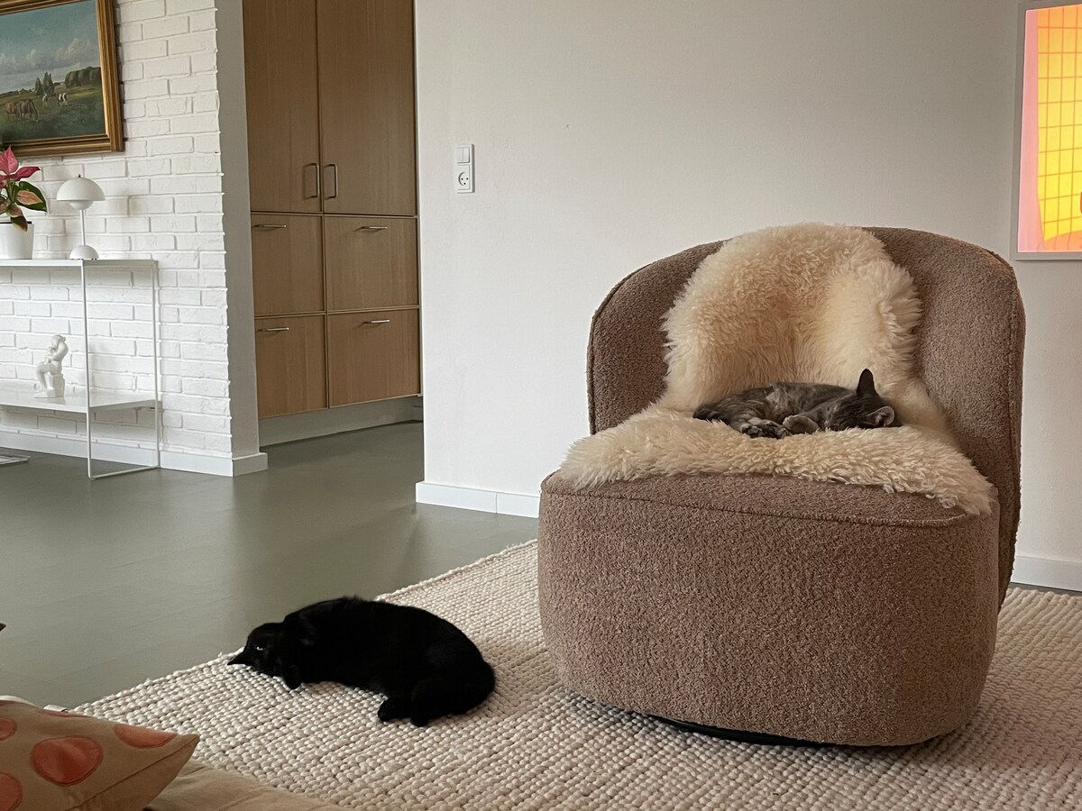 Lovely bright 2-bedroom apartment overlooking the south town. The apartment is furnished with a double bed (180X200 cm), sofa, dining table, etc. The kitchen is equipped with pots/plates, etc. as a vacation apartment. The apartment has a newly renovated bathroom in the basement. There is the possibility to use the garden with a nice terrace. The apartment is close to shopping and with good bus connections. It is 250 meters to the nearest bus stop where 4A and 11 often go into town. Free street parking.