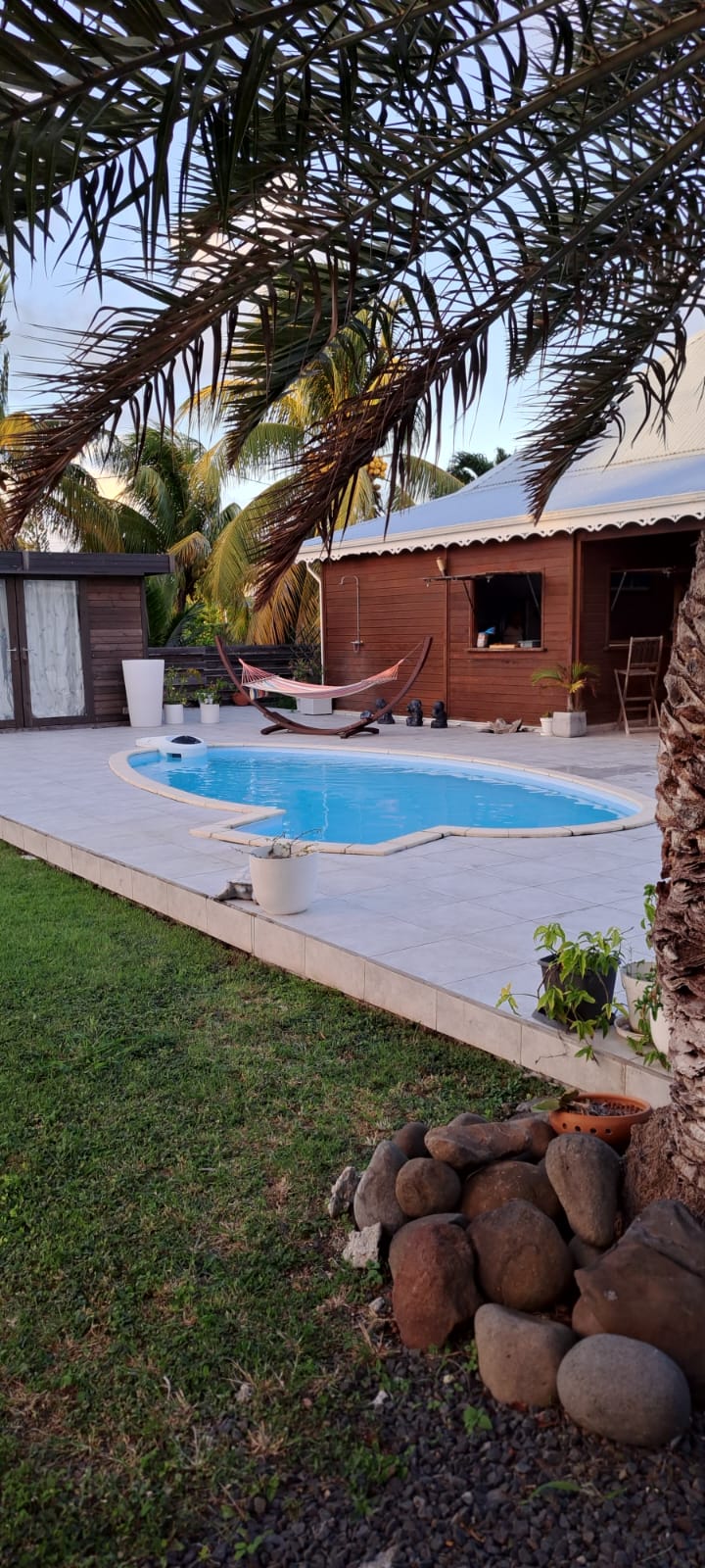 Maison bois de 50 m2 avec terrasse, 4 personnes maximum, piscine de détente privée avec buses spa dans un quartier résidentiel paisible situé à la campagne. À 5 mn du musée Edgar Clerc, 8 mn du centre commercial Baie Side, 15 mn de la Plage de l'Autre Bord & 20 mn de la Porte d'Enfer. Détendez-vous dans ce logement calme et élégant vous y serez les bienvenus. Logement non-fumeur. Les fêtes sont interdites. Pas de décoration pour les anniversaires. Piscine non chauffée. ARRIVÉE A PARTIR DE 15H00.