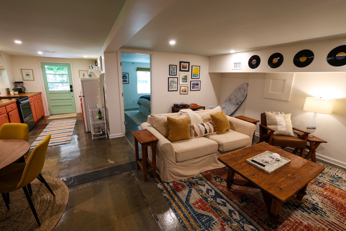Our spacious and secluded guest suite is in the perfect location to enjoy all that beautiful Charleston has to offer. Nestled in a quiet suburb, we’re less than a ten minute drive to the Battery and historic district of downtown, and a fifteen minute drive to Folly Beach. The suite was built in 2023, and includes a multitude of amenities for your perfect trip. With beautiful floor to ceiling windows, the view has sweeping oaks and mature magnolias, setting the scene for your Southern getaway.
