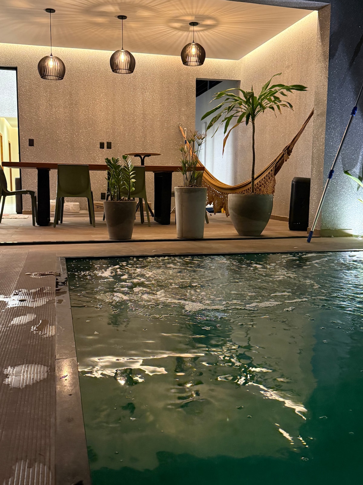 A cozy space with integrated leisure areas. The house has 2 bedrooms, one with air conditioning and a queen bed, the other with a double bed with a fan, both well ventilated. In the leisure area, we have a barbecue, sink, a very large rustic table, a bathroom and the pool that could not be missing. It also has an equipped kitchen and a balcony.