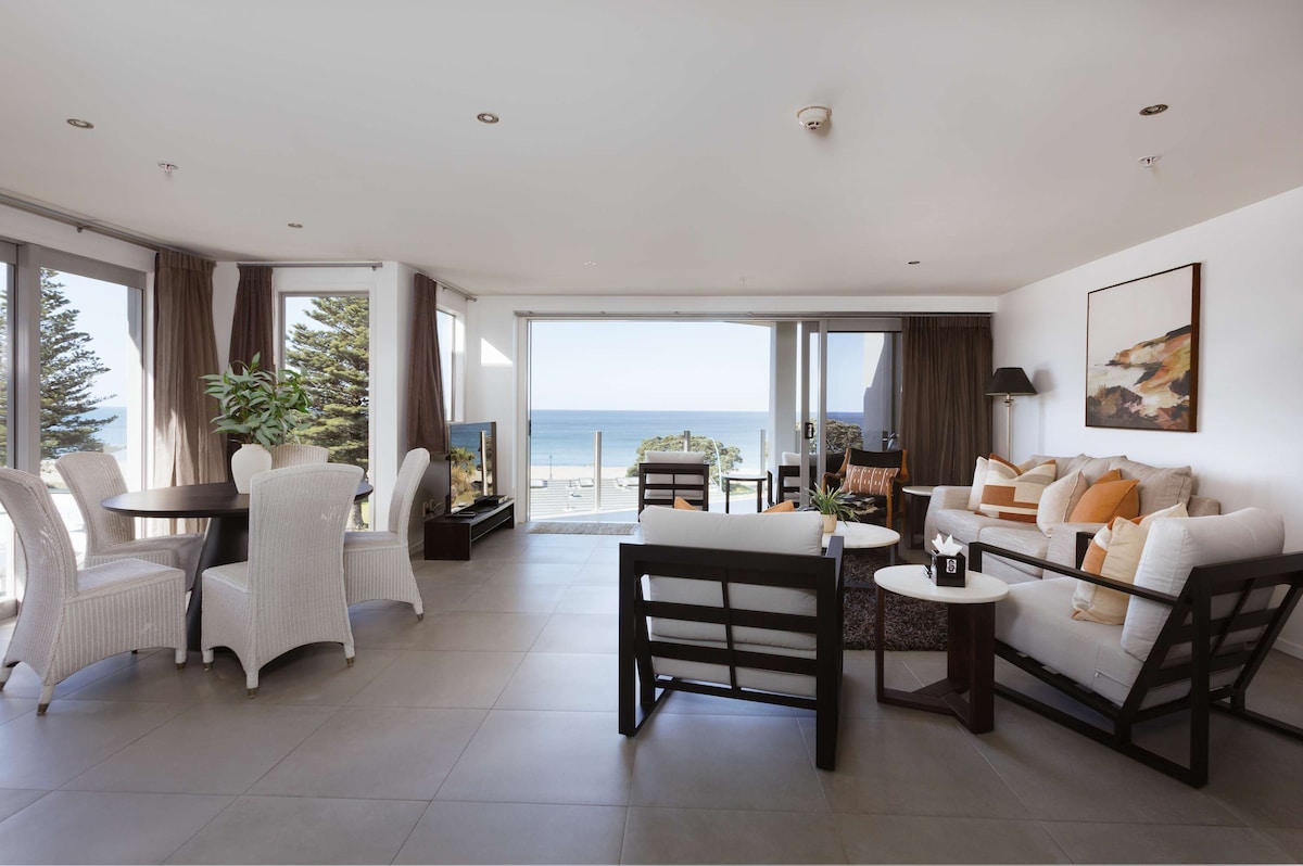 Self-contained downstairs holiday apartment with 1 Queen sized bedroom, own external entrance, the beach & reserve are just across the road. Modern & contemporary, the building has had a leak but the apartment is warm and dry, protected by covered scaffolding above. See photos. This is the reason for the lower price. F&P Double DishDrawer Dishwasher, Miele stove and oven, Nespresso, high speed Wi-Fi, Smart Samsung TV & Sonos sound-bar, quality outdoor furniture, beach towels.