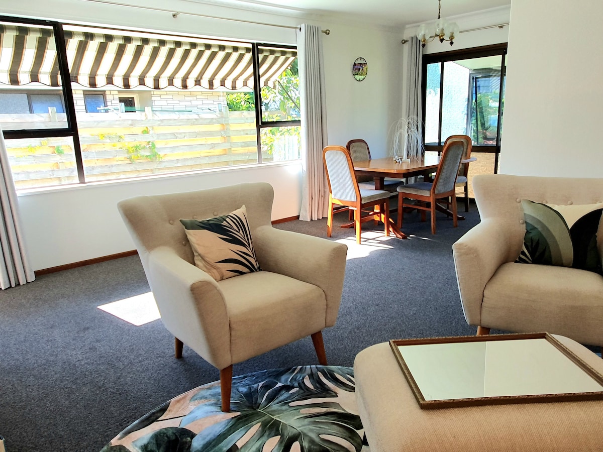 You'll have your own area in our spacious home at the end of a quiet cul de sac with off-street parking, a short distance from the beach, shops & restaurants. You'll be welcomed with a complimentary drink. You have your own entry, sunny bedroom (bed has a near new mattress), bathroom (incl bath, candle & bath oils) & dining room with a continental breakfast provided & coffee from a pod machine. A microwave & toaster are available. Checking in outside of 3-5pm is only by prior approval.