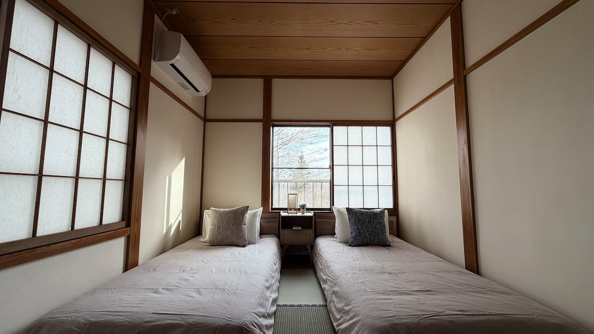 A newly renovated 2-bedroom cabin, nestled in the heart of Myoko Kogen. Just moments off the Myoko Kogen IC, this stylish retreat offers easy access to top ski resorts like Suginohara, Akakura Kanko, Ikenotaira, Tangram, and more. Relax in the cozy open-plan living and dining area, refresh in the brand-new shower room with a serene Hinoki (Japanese Cypress) changing area, and stay connected with high-speed WiFi. We look forward to welcoming you to our home =)