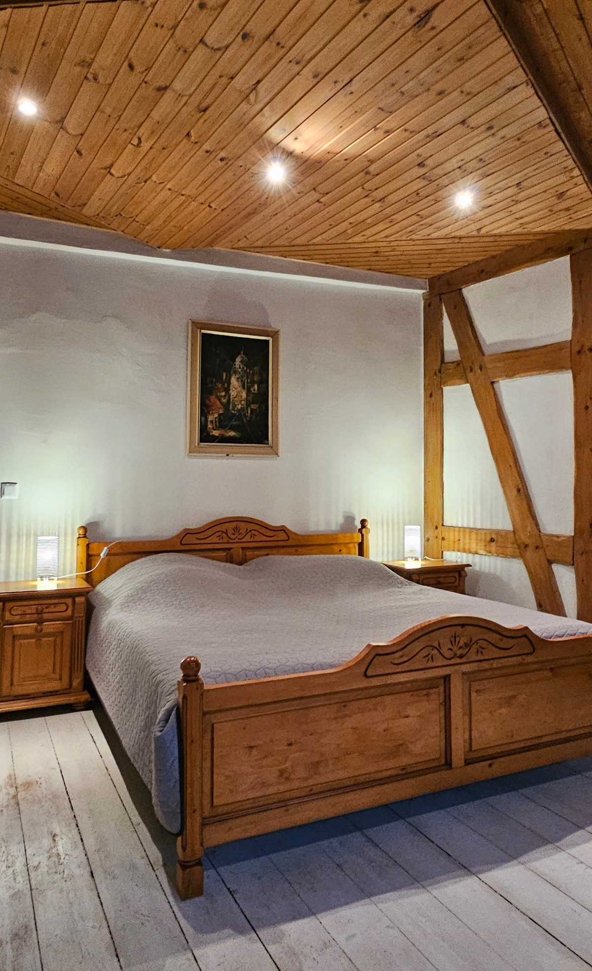 In the lovely South Harz landscape not far from the old town of Nordhausen, which is over 1000 years old, lies our listed protected farm, where our stonemason workshop is located. In the partially converted residential building, in KunstKonsum (gallery-shop-workshop) you will live, among other things. An inspiring place. Enjoy the atmosphere of a house that is over 150 years old with the comforts of today. Let yourself be transported to the good old days and escape everyday life.