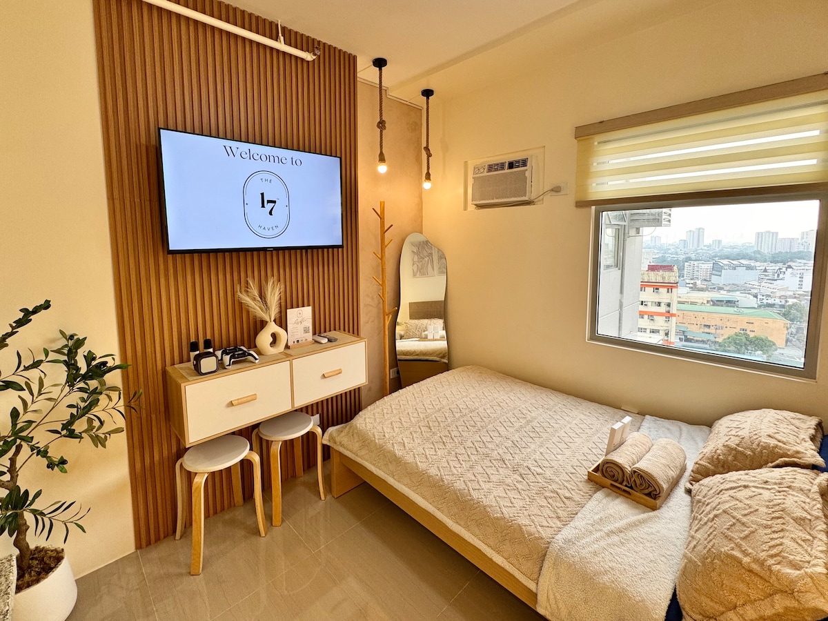 Your ideal work staycation with an unbeatable location! In the heart of Araneta Center, our studio has a dedicated workspace setup (27" monitor, keyboard, workstation)—just bring your own laptop. Enjoy up to 400Mbps WiFi, a comfy queen bed, a city view balcony, and a 43" TV with Netflix. You're just a short walk from major malls like Ali Mall, Gateway Mall, and SM Cubao. All major transport lines (MRT, LRT, Bus Stations) and EDSA are at your doorstep. Book a stay where work and convenience meet!