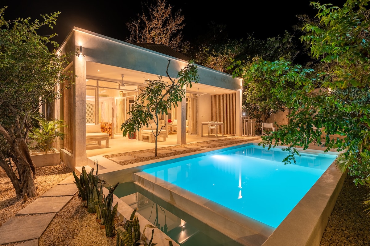 The outdoor space showcases a private pool adjacent to a cozy seating area. The structure features an open design with large windows, allowing natural light to illuminate the interior. Lush greenery and indigenous trees are present, creating a serene atmosphere.