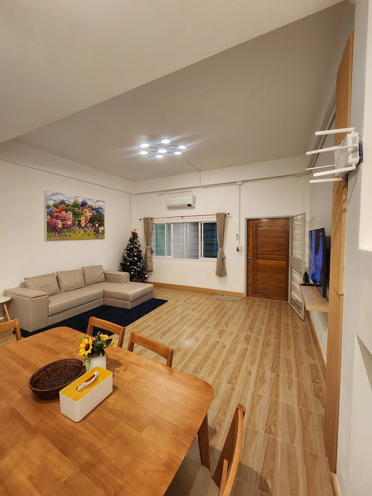 Japanese-Minimalist 2-Story Townhouse with Mountain View Spacious, clean, and cozy, furnished in a Japanese-inspired minimalist style for a calm, home-like stay. 🌳 Peaceful setting near the park with Koh Hong mountain view. ✅ 2 AC bedrooms & AC living/dining area ✅ 3 bathrooms with hot showers (1 downstairs, 2 upstairs) ✅ Private parking for 3 cars (1 inside, 2 in a private garage) – 24/7 access, gated & covered The house has access to Grab and Tuk-Tuk services.