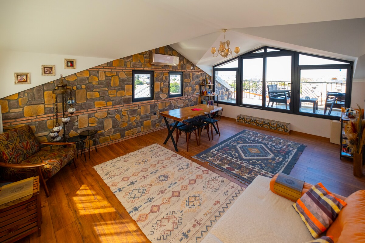 It has a magnificent sea view in the city center. It is very close to the peninsula beaches. We will be happy to welcome you to our penthouse suite, which is suitable for families and couples and offers a jacuzzi.