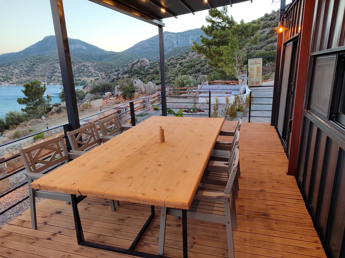 Detached, balcony, panoramic glass, 30 square meters of interior space, large ceiling, wooden, insulated, handmade, 70 cm above the ground, toilet with shower, mini fridge, sea view bungalow. On the driveway, with free parking, 150 meters above sea level, a total of 2000 square meters of magnificent sea view, designed in amphitheater style, 15 minutes walk to Kabak Beach. You can do your shopping and use the shared kitchen, there is a fridge, oven, stove and other kitchen utensils.