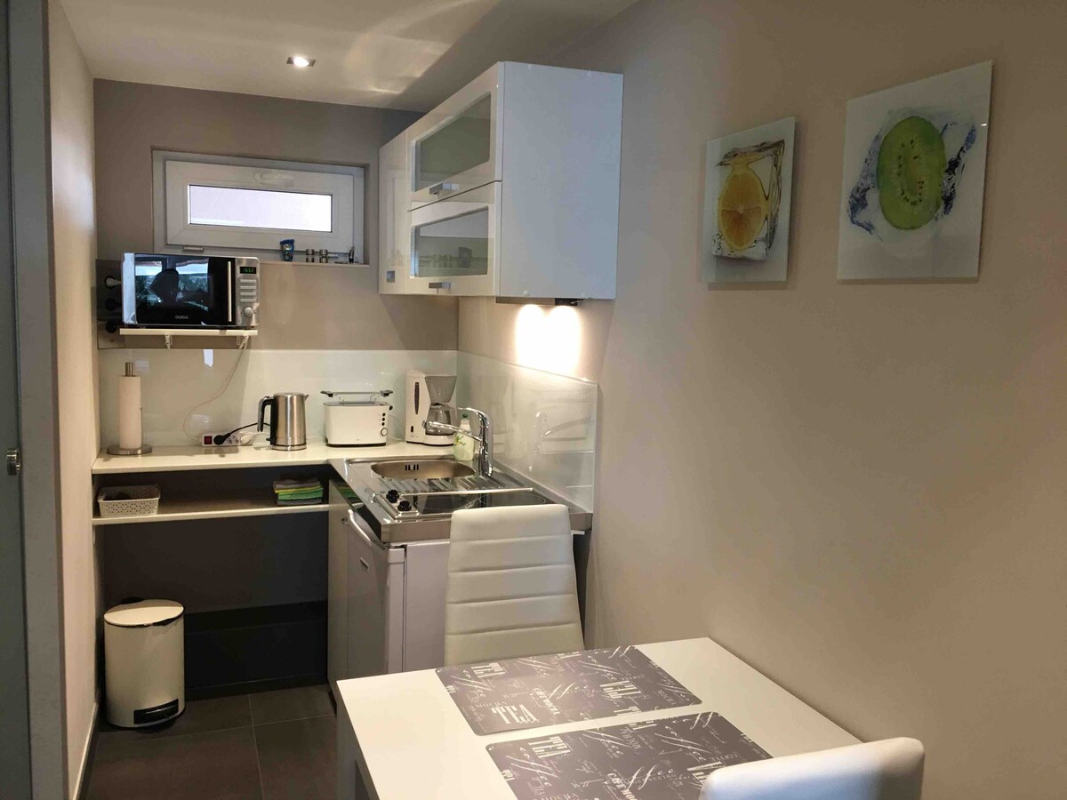 You will move into a granny apartment with bathroom and kitchenette in my house in a quiet location on the outer city wall. A fully automatic coffee machine, a microwave, a Dominokochfeld and a fridge with freezer compartment are part of the kitchen equipment as well as dishes for up to 6 people. The cozy and modern apartment is on the first floor and has its own garden access.