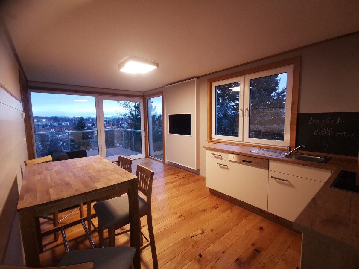 Bright, friendly attic apartment. There is one double bed and one travel cot for infants in the bedroom and one couch in the living room. In the spacious kitchen you can eat in a cozy circle. In the bathroom there is a bathtub with shower partition. The apartment is located in my mom's house. She takes care of the key handover. When booking with a dog, there are an additional €5 per animal per night. Please pay the visitor's tax of €2.50 per person in cash on site.