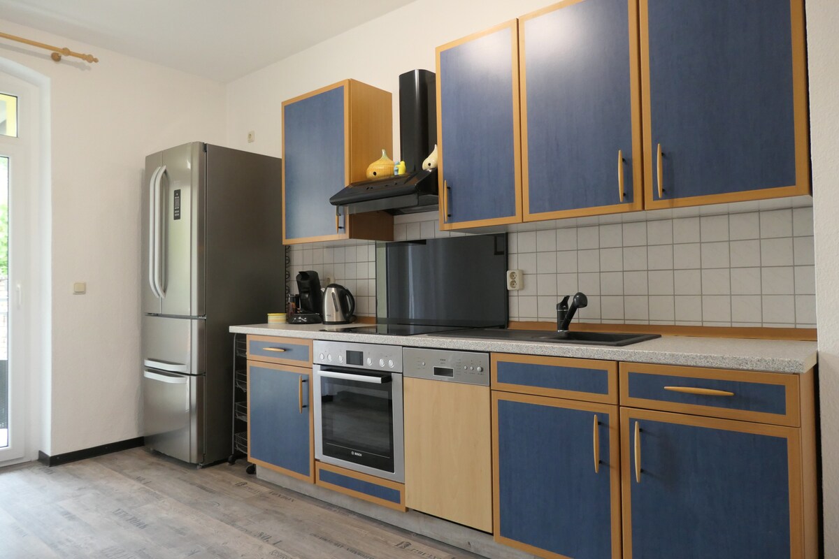 I offer a great furnished 5 room apartment here with a total of three bedrooms, where an entire family or community can be accommodated. A separate toilet and a spacious bathroom are provided. In addition to the well-equipped kitchen and the very spacious and cozy living room, you will find cozy bedrooms. The apartment is on the 3rd floor in the attic. Right in the city center of Mühlhausen/ Thuringia. Ideal for excursions or just a decent overnight stay!