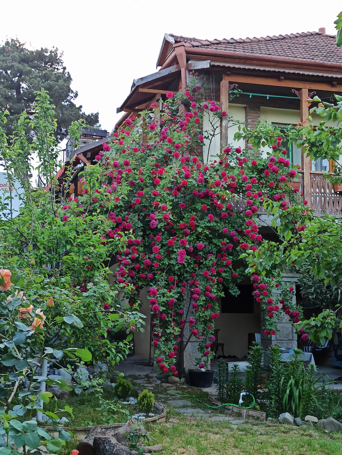 The house is located in the central historical district of Mtskheta. The house has a beautiful view of the garden and the city landscapes. The house has a cozy isolated small yard. Near the house are the city's outstanding restaurants. There is a shop 20 meters from the house. The month of May is special in our yard because many roses bloom in our yard at this time and a special environment is created.