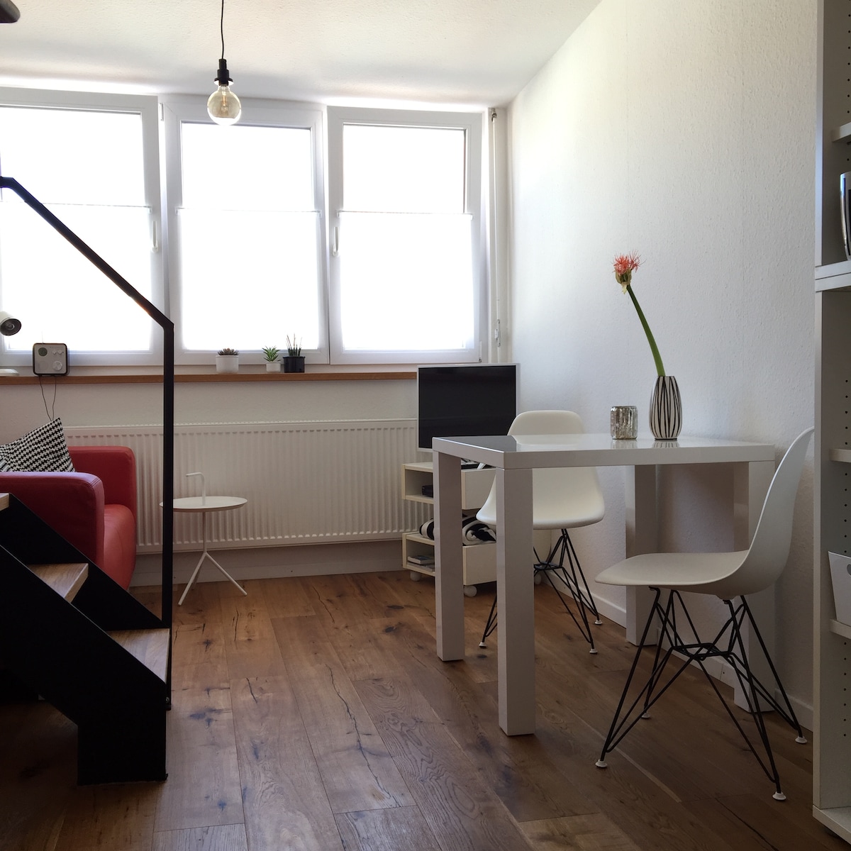 A lovely, newly renovated roof studio equipped with air conditioning. Located in the centre of Konstanz near „Seerhein“ the roof studio can be easily reached by all means of transportation. There are cafes, shopping facilities and a bakery nearby. The studio is perfectly designed for all people who want to feel at ease in the middle of the town. The bathroom is small but practically arranged. There is a kitchenette with a fridge, a stove and a dishwasher.