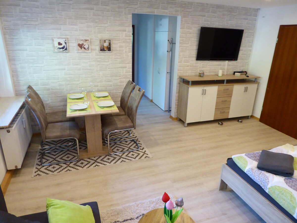 Freundlich und komplett eingerichtete 1-Zimmer-EG-Wohnung (Nichtraucher) für 2 Personen mit Terrasse, separatem Eingang und eigenem PKW-Stellplatz. Ruhige Lage am Ortsrand, 400 m zum See, 100 m zur nächsten Einkaufsmöglichkeit (Supermarkt/Bäcker/Metzger).
