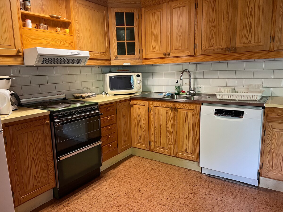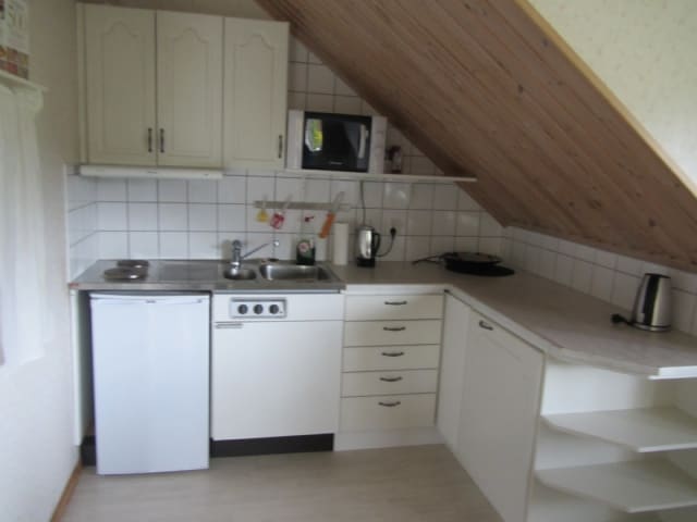 A typical little cottage next to the larger house on an older farm. The decor is typical eighties renovation with a lot of pine, but everything you need for a few quiet vacation days is available. This accommodation is suitable for those who want to take it easy and have other priorities than luxurious comfort. The days may be spent in the woods and nature, or with the canoe that is available in the lake. Once home, you might light the wood stove and let your thoughts wander over the day's events.